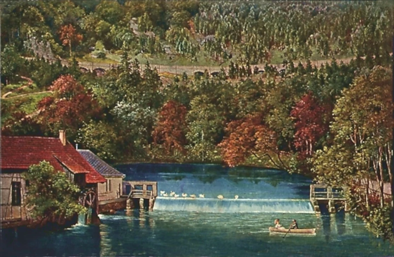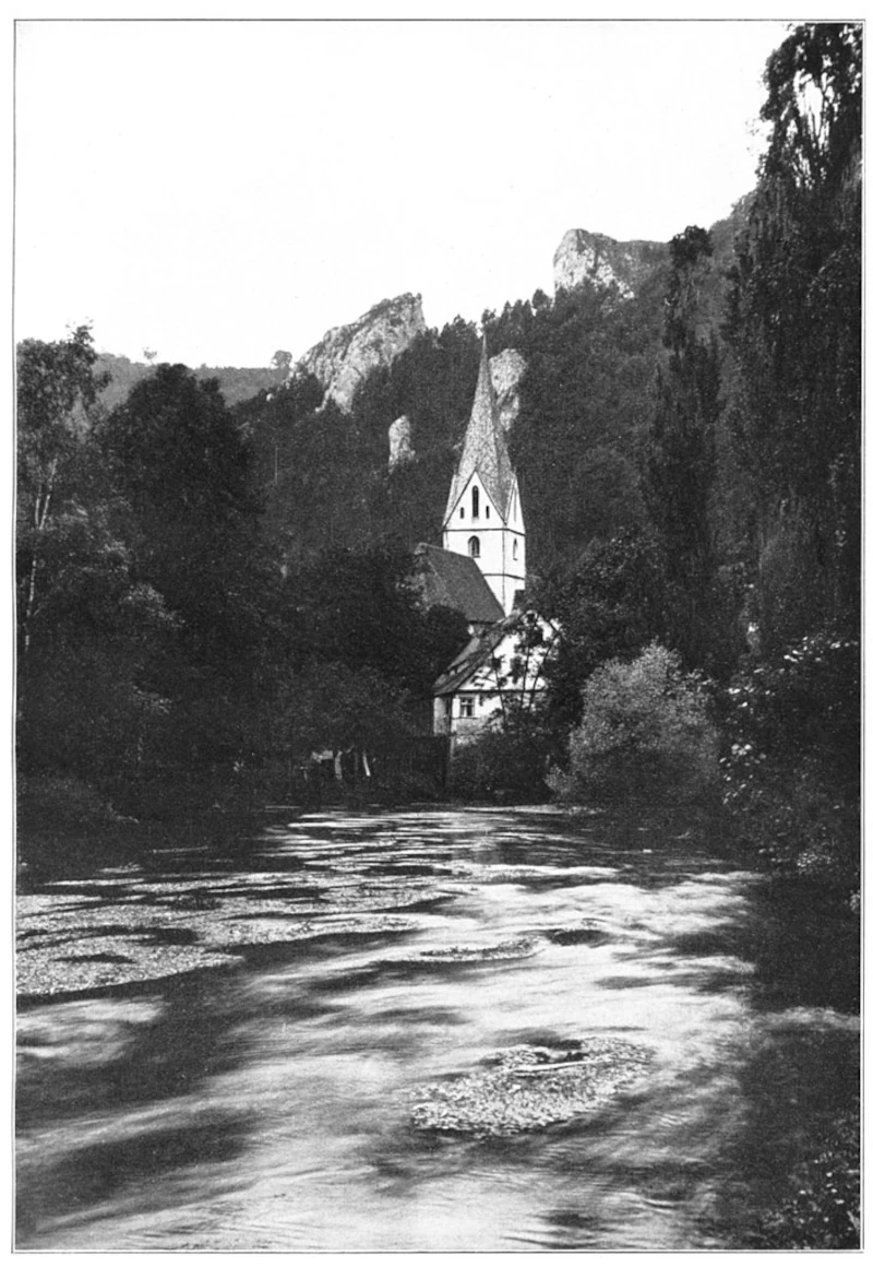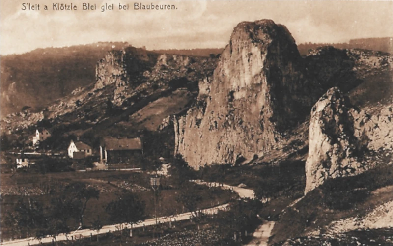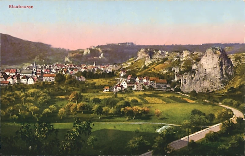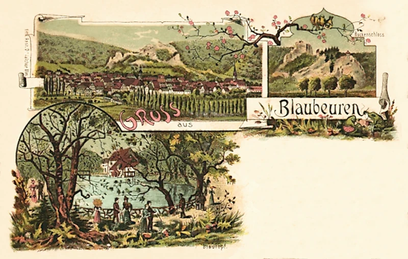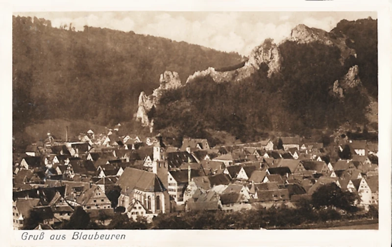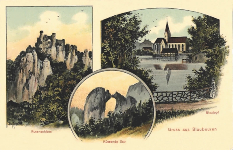 In einem der schönsten Täler unserer Alb liegt die Oberamtsstadt Blaubeuren. Ihren Namen (Beuren, Buron, Born, Bronn-Quelle) hat die Stadt von dem herrlich blauen Quell, der hart am Fuße der Albwand in einem großen runden Kessel von etwa 130 Fuß im Durchmesser aus beträchtlicher Tiefe empordringt. Vor etwa 1000 Jahren, so erzählt die Sage, war der ganze Talkessel, in dem nun Blaubeuren liegt, bis hinab zu dem etwa eine halbe Stunde entfernten Gerhausen von einem finsteren See bedeckt. Düster bewaldete Berghänge und kahle Felswände spiegelten sich in seinen Wassern, und von den kühnsten Gipfeln am Seeufer schauten 3 gewaltige Burgen herab: Ruck, Gerhausen und Blaustein.